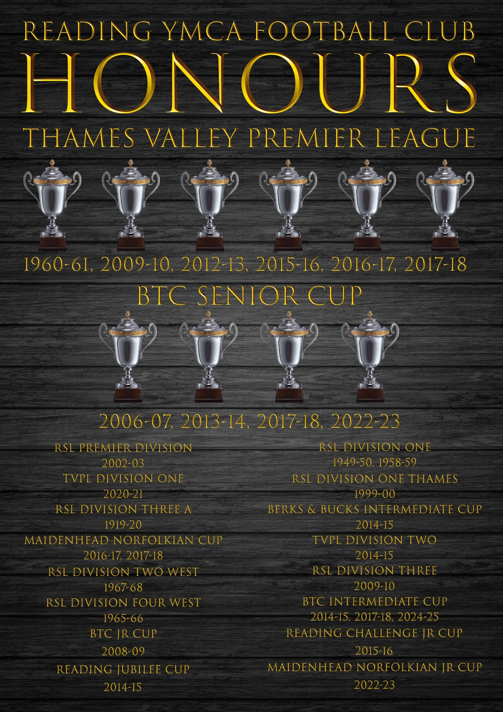 This proceeded the most successful decade in the club’s history with managers Glenn Goudie and Karl Curtis winning 4 more league titles (including 3 consecutive triumphs), 3 BTC Senior Cups, 2 Maidenhead Norfolkian Cups and a Berks & Bucks Senior Cup win in 2014/15. This spell also included back-to-back unbeaten league seasons, a run of 69 unbeaten games between March 2016 to November 2019 - the longest unbeaten run in the entire football pyramid at the time. The team sadly folded after the run finished and the club had to rebuild around the remaining Reading YMCA Rapids players in TVPL Division One.